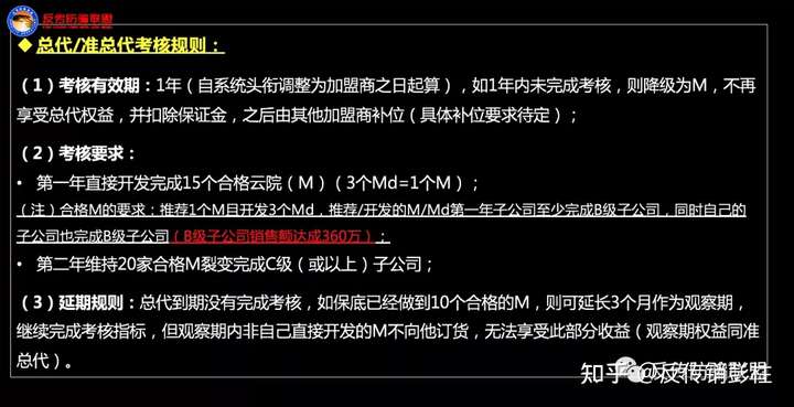 考核要求则是需要总代第一年直接开发完成15个合格云院M(3个分院dm=1个云院M),而合格云院M的要求则是需要推荐1个M且开发3个Md,且推荐或开发的M或Md至少要完成B级子公司,同时自己的子公司也完成B级子公司(B级子公司销售额达成360万),第二年维持20家合格M裂变完成C级(或以上)子公司。