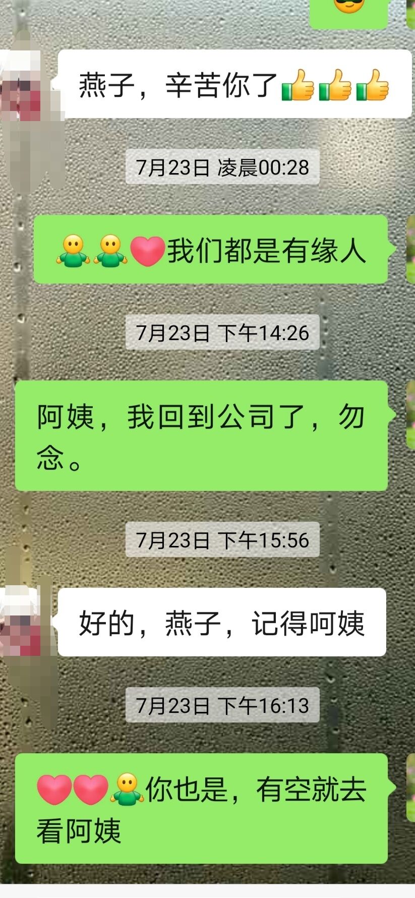 当天的劝说一直持续到凌晨时分,阿姨发现问题以后迅速的作出了表态,虽然未曾表明自己一定不会去,但是言语之中对于家庭的坚守已将自己的立场表明得十分清晰。吃饭,聊天,问候,归到家中收到她给我发来信息叫我不要忘了她时,我忽然发现这人间竟如此有爱。