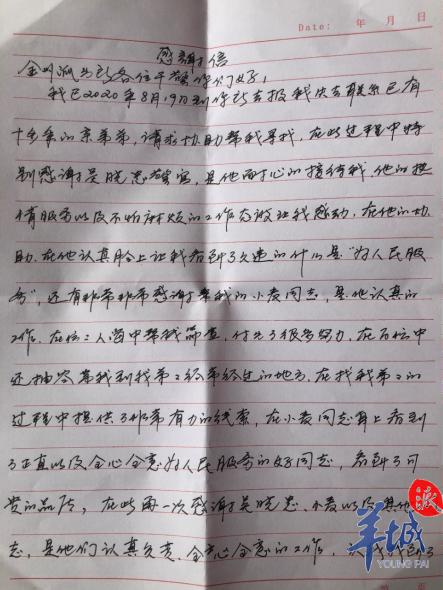 为表谢意,唐某带着亲笔书写的感谢信来到金洲派出所。“在你们身上我看见了什么是‘为人民服务’,非常感谢你们帮我找到了弟弟”,唐某对经办民警说。