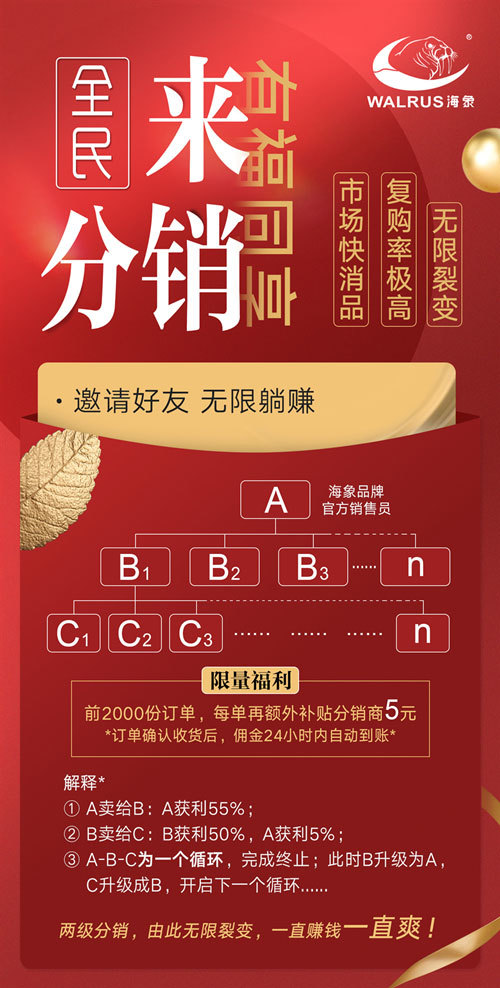 还大额让利给各位分销商,定期推出优惠、奖励等活动,让每一位信任海象的分销商都享受早期福利,只是希望各位分销商同仁可以助力海象品牌的树立,仅此而已。