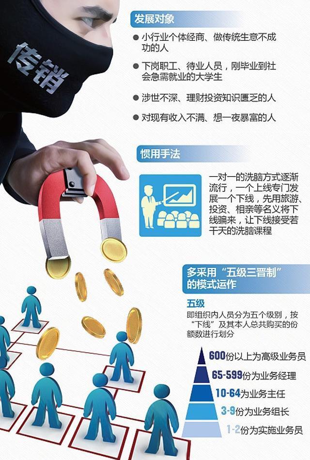 第三条,就是暴力关押、限制人身自由,敲诈等方式获利。这是比较早期的传销的方式,随着法律健全和社会治安的改善,这种已经越来越少了。
