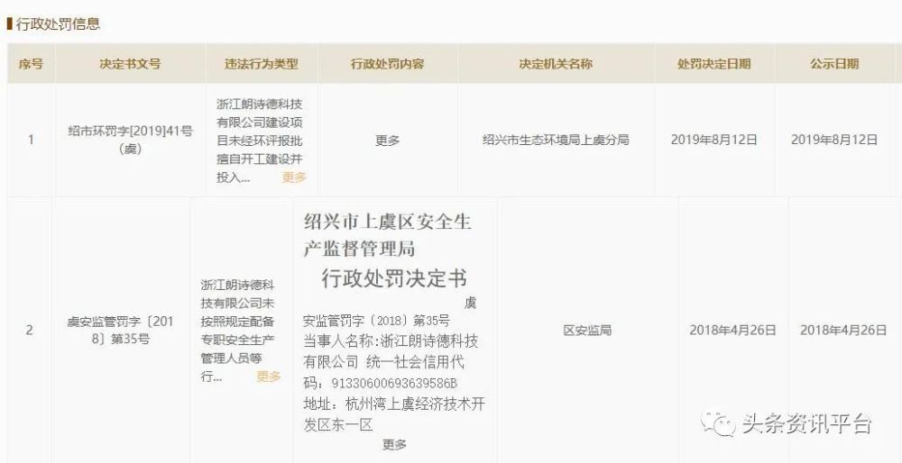 值得一提的是,浙江朗诗德科技有限公司还曾不止一次地遭到过有关部门的行政处罚,2018年4月,该公司因未按照规定配备专职安全生产管理人员等行政处罚案,遭到上虞市区安监局处罚。