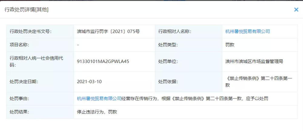 近日,社交财经在企查查APP注意到一则行政处罚(滨城市监行罚字〔2021〕075号),该行政处罚企业是一家名为杭州暑悦贸易有限公司,处罚单位是滨州市滨城区市场监督管理局,处罚事由:杭州暑悦贸易有限公司经营存在传销行为。处罚依据:根据《禁止传销条例》第二十四条第一款,应予以处罚。具体罚款金额未公示。