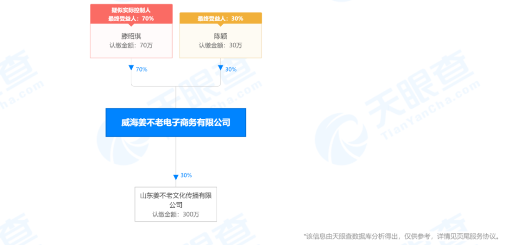 据天眼查APP显示,威海姜不老电子商务有限公司成立于2018年12月20日,实缴资本为100万元,陈在福担任执行董事,陈颖担任经理,持股30%,滕昭琪持股70%。值得注意的是,今年2月19日,该公司法人由滕昭琪变为陈在福。