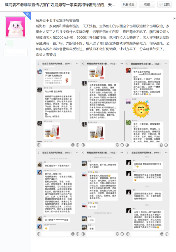 那么,该公司为何会涉嫌传销被罚呢?目前行政处罚书没有公布相关详细内容,但中新观察在百度贴吧发现有网友发帖留言反映威海姜不老相关情况。