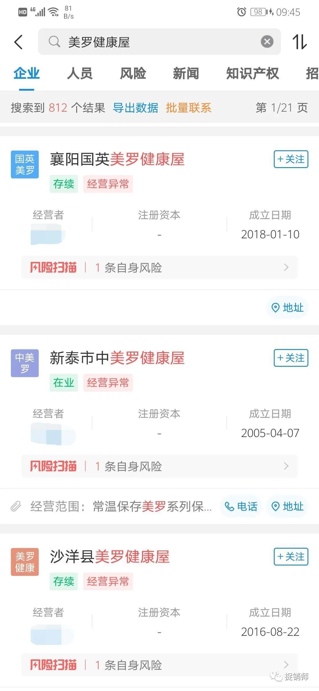 曾全国遍地开花的美罗健康屋有不少已被列入经营异常(截图于企查查APP)