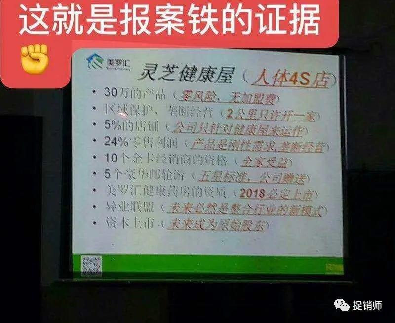 广东卫视在调查美罗汇药房涉嫌原始股权做噱头的报道时,报道了开一家灵芝健康屋可以享受的权益:1、区域保护,垄断经营(2公司只许开一家)2、次月返利3-4万现金作为启动资金 3、5%的店铺 4、24%的零售利润 5、10个金卡经销商的资格(全家受益)6、赠送5个豪华邮轮游 7、拥有美罗汇健康药房的资质,2018年必定上市,但现在显然没有成功。8、异业联盟,未来必然是整合行业的新模式。9、切入微商,推荐商户入驻,可以有30%的利润。