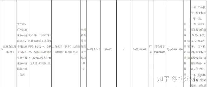 2020年3月17日,国家药品监督管理局网站发布关于34批次不合格化妆品的通告(2020年 第21号)。通告中称:在国家化妆品监督抽检工作中,经新疆维吾尔自治区食品药品检验所等单位检验,发现多款产品违反《化妆品卫生监督条例》等相关法规的规定。其中汉典染发膏(棕黑)赫然在列。