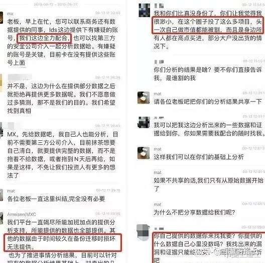 从上述的聊天中能看出来MXC交易所的不清不白,首先项目方要数据时,交易所回复“互相尊重,需要时间”,“交易所数据不符合,MX推脱数据损坏”。