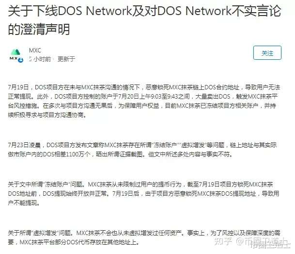 DOS的控告抹茶交易所虚拟增发数字货币,导致一直暴涨的DOS短时间内被砸盘。