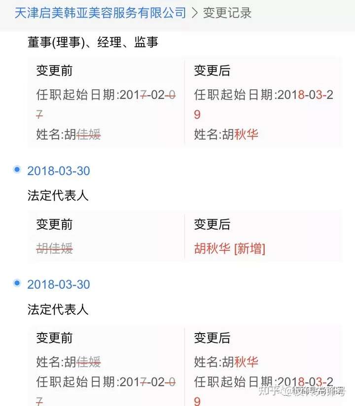 另外,我们发现在胡佳媛名下,还有另外一家公司——天津启美韩亚美容服务有限公司(后文简称“启美韩亚”),该公司在2017年便成立,2018年3月法人代表由胡佳媛变更为胡秋华。