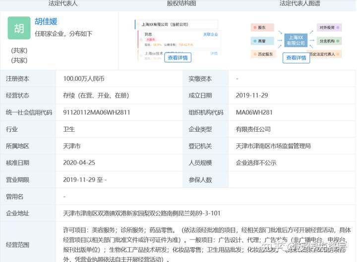 与此同时,还有一家天津云舒生物技术有限公司,于2019年10月18日成立,注册资本500万元,实缴0元,由胡佳媛与公司法人李欣对半持股,目前,该公司经营着名为“姝美荟”的公众号和“舒肌之语”的小程序店铺。