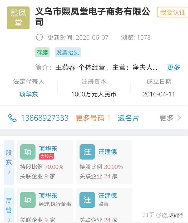 熙凤堂成立于2016年,法人项华东(持股70%;兼任经理和执行董事);监事汪建德,持股30%。