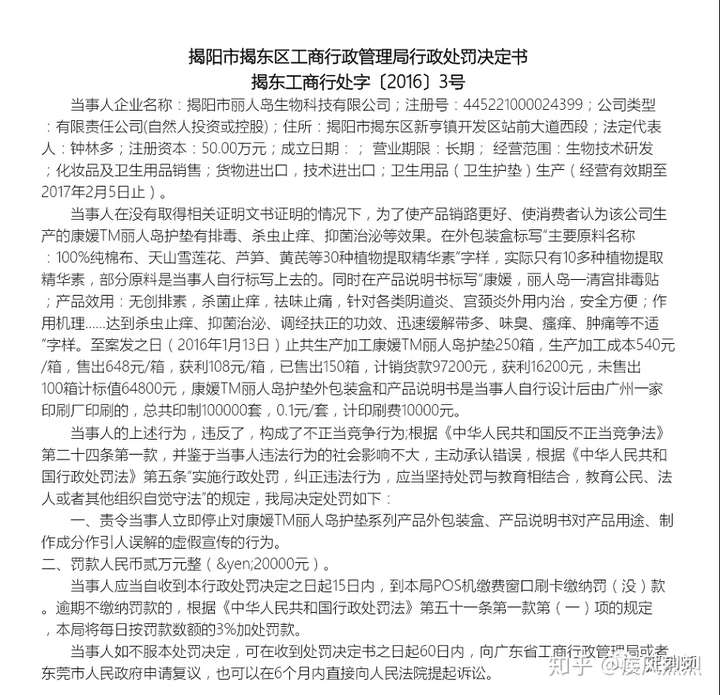 在处罚决定书中写道:“为了使产品销路更好,使消费者认为该公司生产的康媛TM丽人岛护垫有排毒、杀虫止痒、抑菌治泌等效果。”“同时在产品说明书标写康媛——丽人岛清宫排毒贴;产品效用:无创排素,杀菌止痒,祛味止痛,针对各种阴道炎、宫颈炎外用内治,安全方便;作用机理......达到杀虫止痒、抑菌治泌、调经扶正的功效,迅速缓解带多、味臭、瘙痒、肿痛等不适字样”。