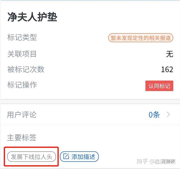 另外值得一提的是,净夫人护垫因主要标签为“发展下线拉人头”已被认同标记162次。