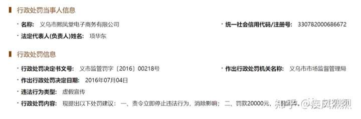 经查询得知,熙凤堂早在2016年7月,因虚假宣传行为遭到义乌市场监督管理局处以20000元的罚款,要求其“停止违法行为,消除影响。”