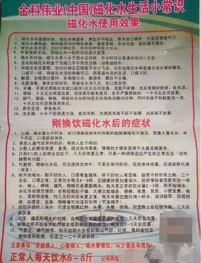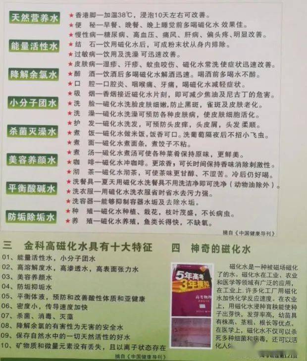 据网上流传的宣传资料,磁化水,是指一种被磁场磁化了的水,而金科高磁化水可以称得上是万能的神水,不仅能治香港脚、防止黑斑、治疗皮肤病、便秘、结石,改善糖尿病、高血压等慢性病,还能美容养颜。