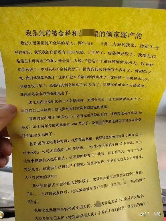 一位来自于金科伟业受害者K的自白:“我是怎么被金科伟业和董姓夫妇骗的倾家荡产”,这位受害者原来是做白酒生意的,当时手上还有5000箱白酒,然而在董姓夫妇忽悠和诱导下让K放弃做白酒生意,跟着他们一起做金科伟业的代理商,而且还承诺K要帮助把这5000箱白酒分销出去,并忽悠K只要开始做金科伟业就能如何赚大钱,很快实现财富自由等等,K就听信了董姓夫妇的话贷款花了20多万元买了70多台金科沃特高磁化水器,并没有像董姓夫妇所说的那样好能够赚钱,反而噩梦才开始;K给金科伟业公司打款27000元购买了8台金科沃特高磁化水器后,金科伟业给K发放340多元的佣金,一台3380元磁化水器赚40多元钱,而K的上级经销商却能赚好几千元,再上面一级的经销商一台能赚好几百元钱,其核心就是自己囤货,买了那么多的磁化水器并不赚钱,只能通过发展下线拉人头加入金科伟业的会员,从中层层抽取提成才能赚到大钱,K自从做了金科伟业以后认识了很多金科伟业的经销商,但他们很多人并不赚钱反而都在赔钱,自从K在董姓夫妇的怂恿下开始做金科伟业到目前为止已经负债一百多万元;K经销商仅仅是金科伟业众多受害者一个很小的缩影而已,他用自己做金科伟业的亲身经历证实金科伟业并不是仅仅卖产品为导向赚钱,而是需要拉人头、囤货一步一步发展下线才能赚到钱。