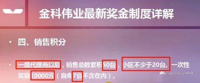 一级代理商以后,销售总数累积50台,小区不少于20台。一次性奖励10000元(自身7台不含在内)。