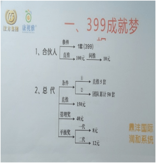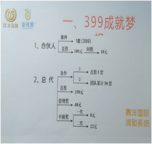 她在画板上边讲边画:“我们有几大奖项分别是:直推奖、管理奖、平级奖、分红奖、团队积分奖、区域收租奖,你只要投资399元就可以获得以上奖励,我们有几种投资给到你选择。一、合伙人:399元认购一套产品;二、总代条件:1、直推五套产品,2、团队累计销售满50套产品;三 、CEO条件:1直推5套,2团队累计满500套,3自己向下直推的两组市场各销售满50套以上;四 、 一星CEO条件:下面直推会员中两个完成CEO身份;五 、 二星CEO条件:下面直推会员中三个完成CEO身份;六、 三星CEO条件:下面直推会员中5个完成CEO身份;七、家庭店、总代身份(投资15960元);八、店中店总代身份(投资29000元);九、旗舰店CEO身份(投资135000元)。”
