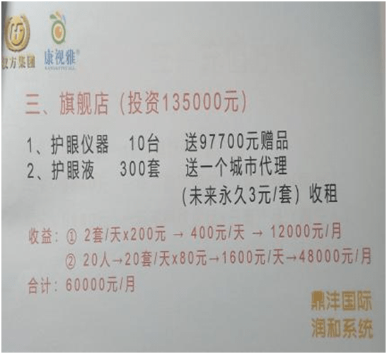 在认购商品成为会员后,康视雅公司推出的奖金制度名目繁多,仅举“旗舰店CEO”为例,叶女士介绍说:“旗舰店CEO身份(投资135000元)一、护眼仪器10台,二、护眼液300套,送97700元面膜赠品,送一个城市代理,(未来只要有公司产品进入你区域永久享受3元\套)区域收租奖。例:直推每天卖两套产品,每套利润200元,400元\天,月收益12000元。按直推20人算,每人\天卖一套,每天是20套产品,管理奖的合伙人部分:80元套,1600元\天,月收益48000元,合计:64000元月收益。”