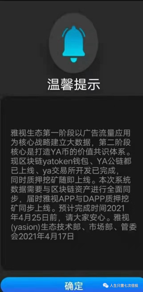 雅视这么无耻的项目方一年只出一个,上一个就是陈佳的链信,陈佳后面又发行了三十多个项目,雅视的项目方估计也差不多,如果这次不直接关网跑路,那么未来得有300个项目等着这群想回本的韭菜。