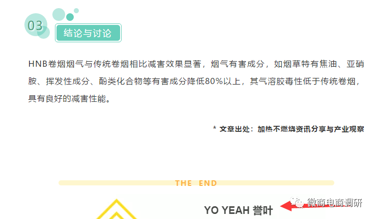 值得注意的是,官方微信公众号“香誉”曾转载了“加热不燃烧资讯分享与产业观察”的文章,这篇文章通过研究得到了这样的结论:“HNB卷烟烟气与传统卷烟相比减害效果显著,烟气有害成分,如烟草特有焦油、亚硝胺、挥发性成分、酚类化合物等有害成分降低80%以上,其气溶胶毒性低于传统卷烟,具有良好的减害性能。”可见,该结论对应的研究对象并非香誉产品,而是HNB产品,而且其减害作用只是被标注了百分之八十以上,而非百分之九十以上。