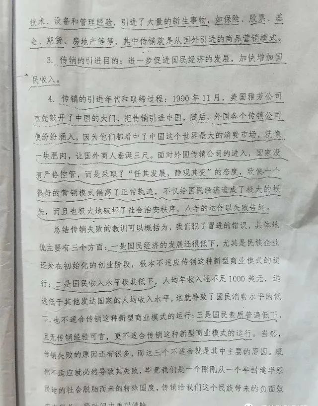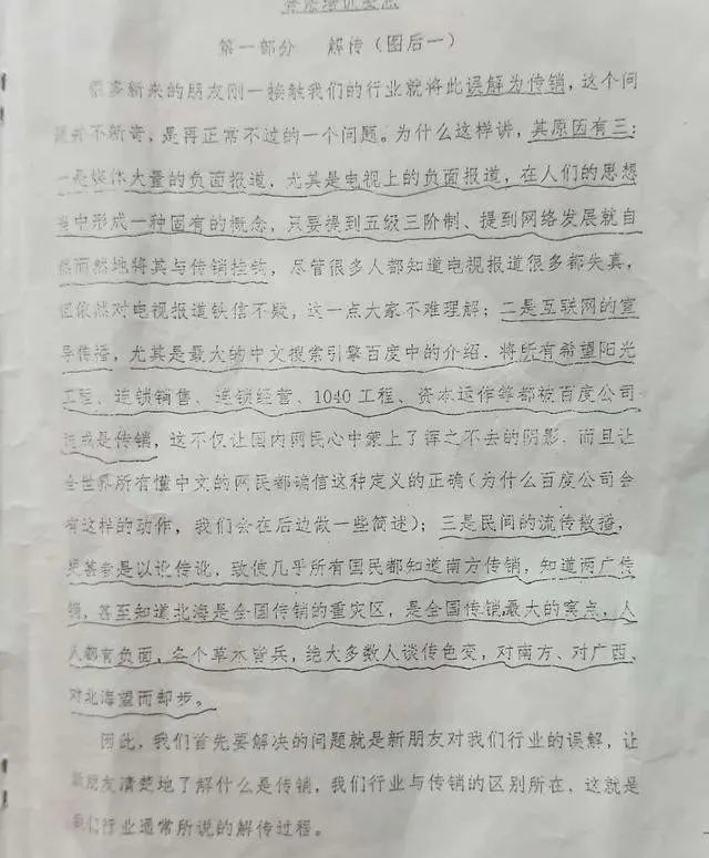在1040传销中要学习的资料有很多,比如怎么谎言邀约,开心门,怎么给新人上课等等。就拿上图来说,这是1040传销内部的讲课培训资料的部分内容,俗称三班。1040传销人员在通过素质课(所谓的八大心态)后,就要学习讲一班工作,成为传销讲师,也就是当新人来的时候,可以给新人去上课洗脑。从上面的传销内部资料可以看出,1040传销人员学习还是挺下功夫的,用笔将一些关键的地方作下划线,然后将这些内容死记硬背下来,通过不断地模仿练习,最后讲课给新人听。