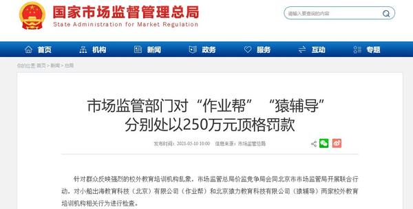 2021年5月10日,北京市市场监管局依法对作业帮和猿辅导两家校外教育培训机构,均处以警告和250万元顶格罚款的行政处罚。