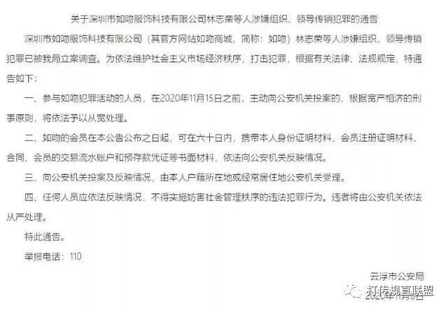 2020年11月8日,肇庆市警察评定深圳如吻企业该经销商个人行为涉嫌传销,传出通知。
