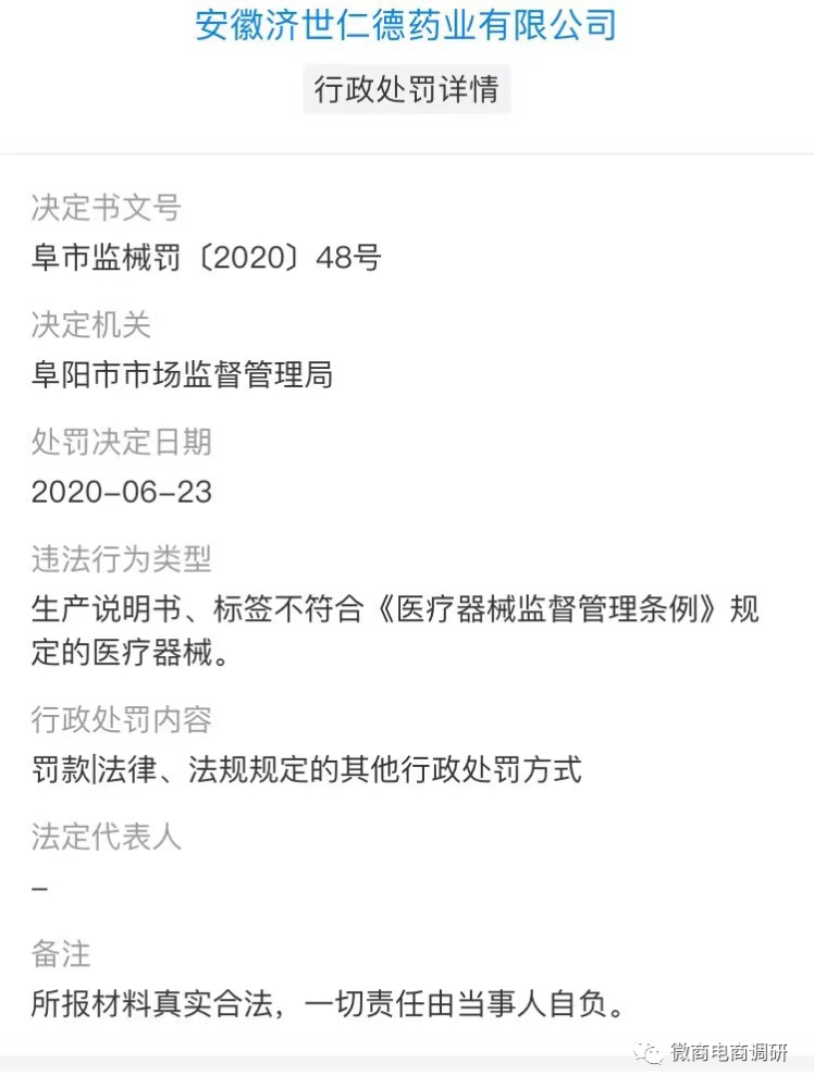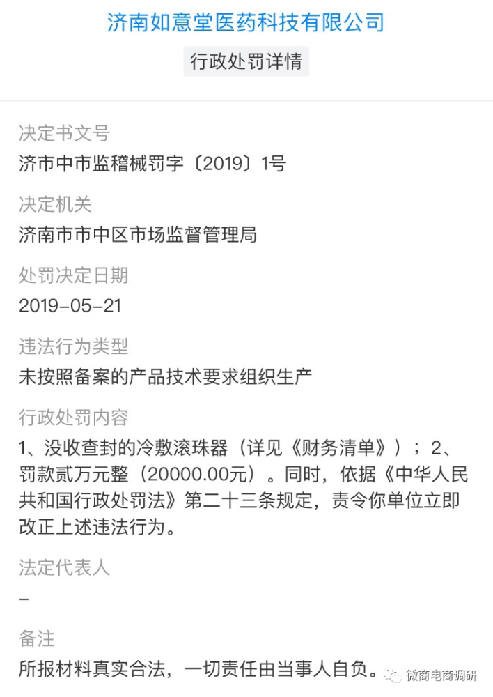 值得一提的是,这家济南如意堂医药科技有限公司在2019年5月,因未按照备案的产品技术要求组织生产的违法行为,受到当地市场监督管理局作出的没收相关产品(冷敷滚珠器)并罚款两万元的行政处罚。