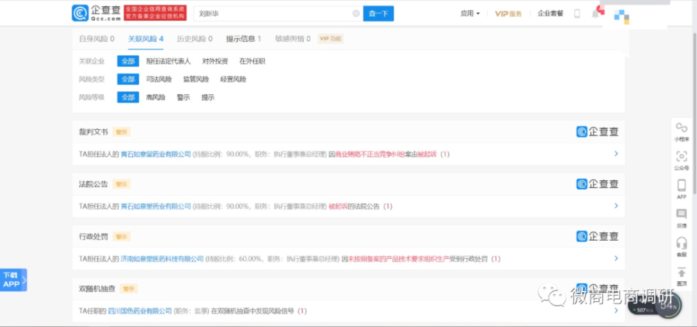 由刘新华担任法人的黄石如意堂药业有限公司曾因商业贿赂不正当竞争纠纷案由被起诉,由他担任监事的四川国色药业有限公司在双随机抽查中发现风险信号:未按规定公示应当公示的信息。