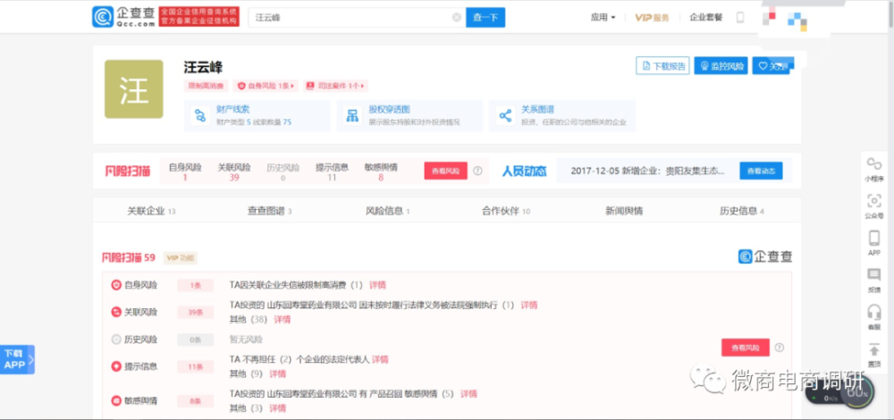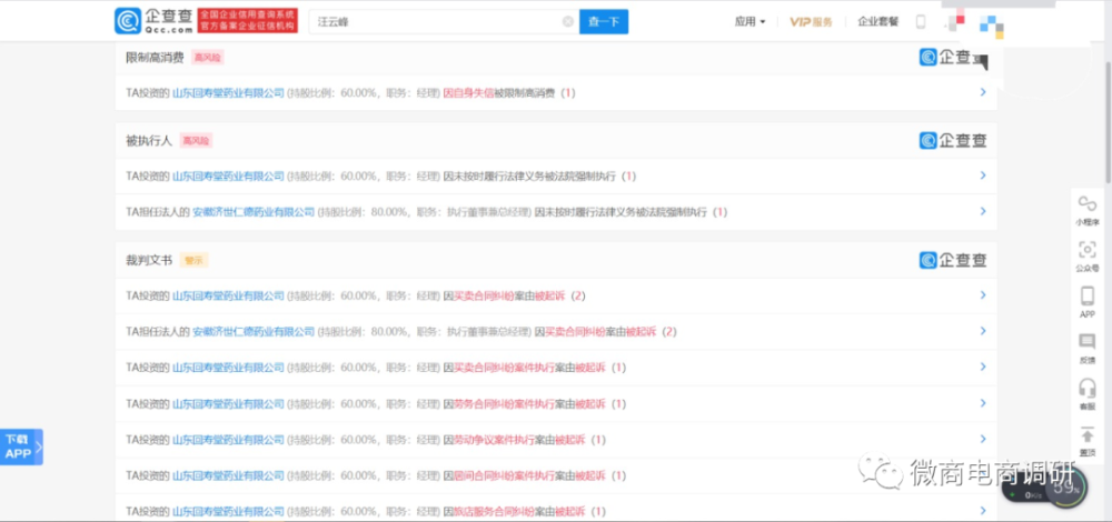 由汪云峰投资的山东回寿堂药业有限公司曾多次因买卖合同纠纷、劳务合同纠纷、居间合同纠纷、旅店服务合同纠纷等被起诉,该公司同样因未按时履行法律义务被法院强制执行,而汪云峰本人也因关联企业失信被限制高消费。