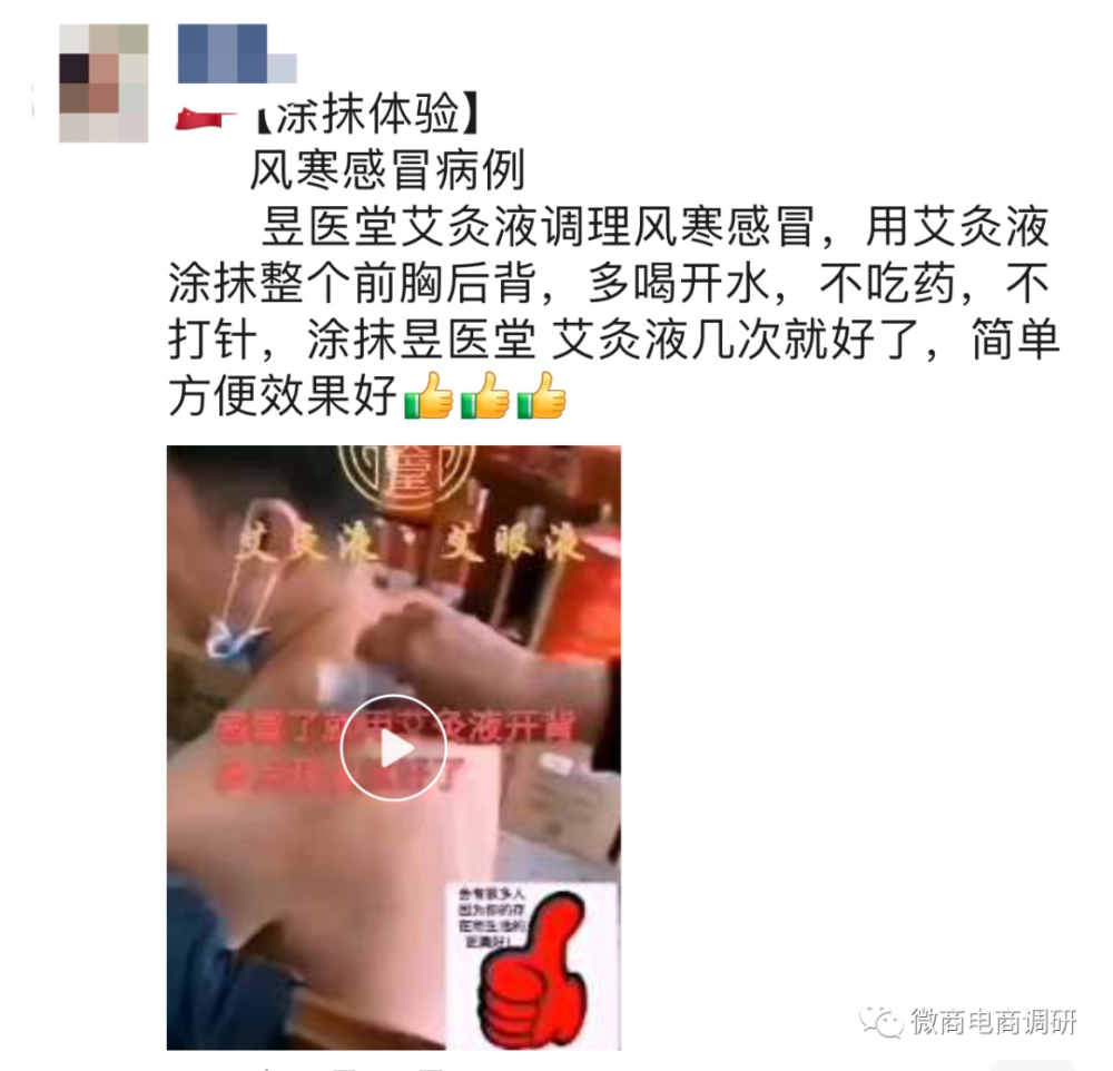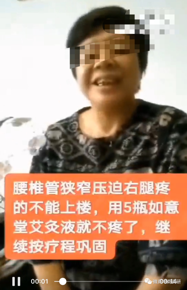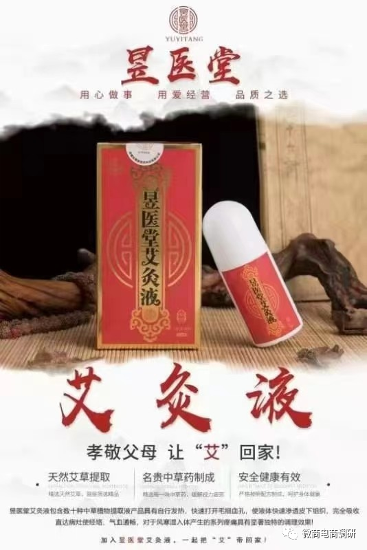 据悉,艾灸液原来叫做如意堂艾灸液,后来升级叫做昱医堂艾灸液,产品宣扬包含艾草、红花、透骨草、九里香等数十种中草植物提取液,能够自行发热,快速打开毛细血孔,使液体快速渗透皮下组织,一分钟涂抹,两到三分钟渗透直达病灶,效果立竿见影。