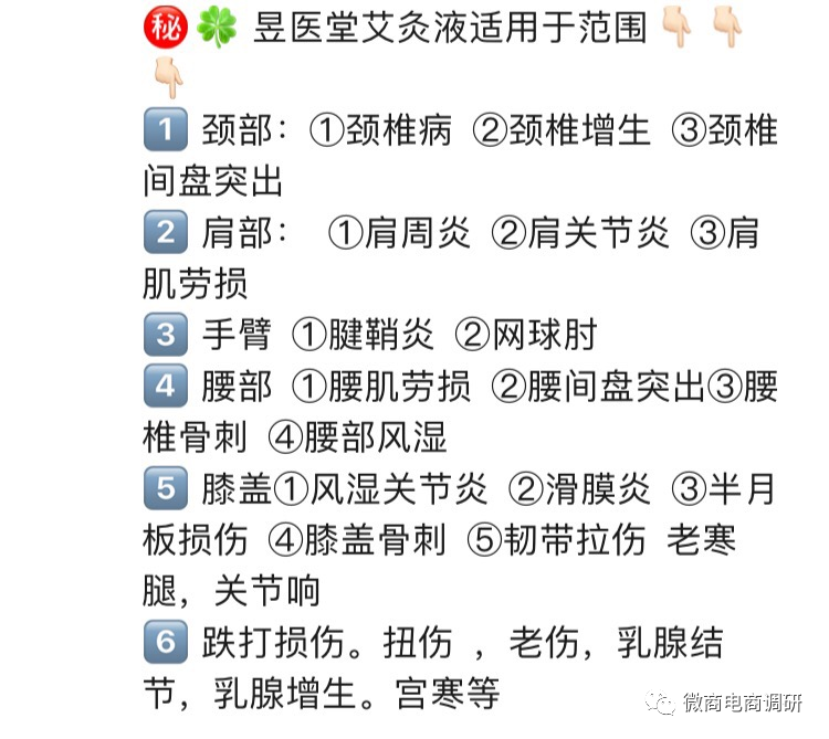 在产品的宣传资料上,还明确显示了昱医堂艾灸液的适用范围:针对颈部的颈椎病、颈椎增生、颈椎间盘突出;针对肩部的肩周炎、肩关节炎、肩肌劳损;针对手臂的腱鞘炎、网球肘;针对腰部的腰间盘突出、腰部风湿;针对膝盖的滑膜炎、老寒腿、风湿关节炎,甚至对乳腺结节、乳腺增生、宫寒等其他疾病也有奇效,可以说是包治百病。