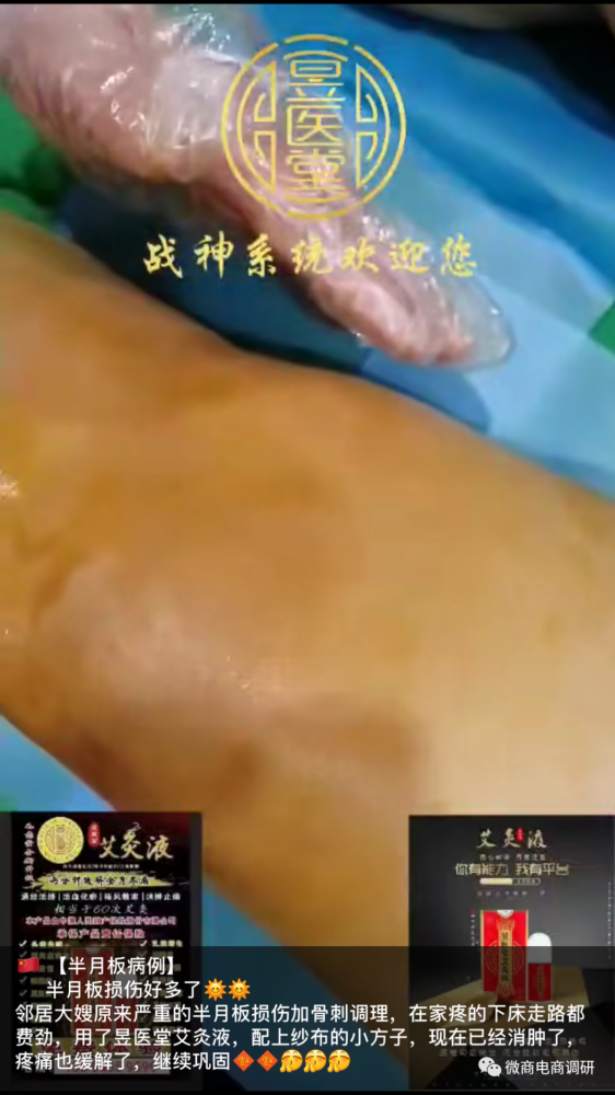 与此同时,还有诸多经销商发出来的患者使用分享,无一不是在佐证这款“灵丹妙药”的神奇功效:原来严重的半月板损伤加骨刺调理,在家疼的下床走路都费劲,用了昱医堂艾灸液,已经消肿了,疼痛也缓解了。