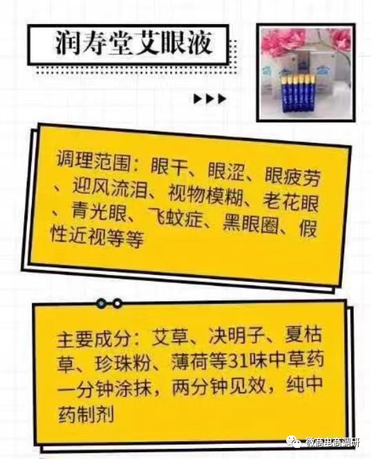 至于润寿堂艾眼液,顾名思义,主要用于眼部,该产品宣称能够调节眼内血液循环,排出眼内垃圾毒素,净化眼球,30秒解决眼干、涩、酸、痒、痛等,效果持久,可以有效缓解因电子设备等外界问题带来的视力疲劳、视力下降、黑眼圈等多种问题,同时对假性近视、迎风流泪、老花眼、青光眼、飞蚊症等眼部疾病也有效果。
