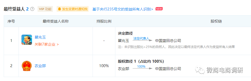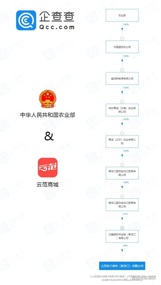 经查,云范电子商务(黑龙江)有限公司的法人股东是云巢国际供应链(黑龙江)有限公司(2021年3月9月,该公司才正式投资云范公司),投资云巢国际公司的则有两位股东,其一是黑龙江国舟进出口贸易有限公司。继续深究,黑龙江国舟公司的独资股东是黑龙江国梵进出口贸易有限公司,而青诚(辽宁)实业有限公司又是黑龙江国梵公司的股东。青诚(辽宁)实业有限公司的独资股东是裕东青诚(云南)实业有限公司,后者的企业法人是蓝田新能源有限公司,该公司的企业法人是中国蓝田总公司,该公司的法定代表人名叫瞿兆玉,据多家企业查询平台显示,农业部为中国蓝田总公司的股东。