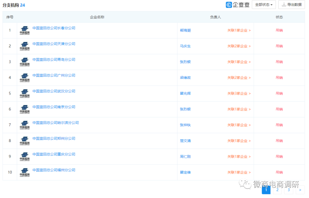 据企查查显示,中国蓝田目前共有24家分支机构,其中23家都已处于吊销或注销的经营状态。