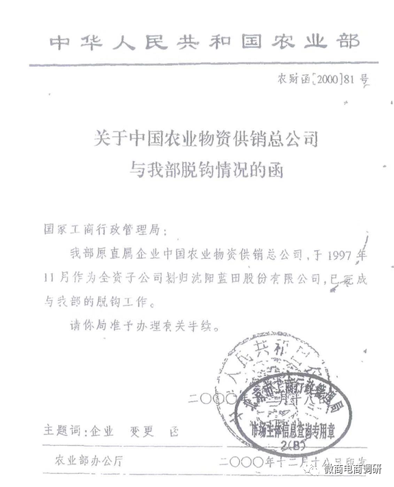 2000年12月18日,农业部办公厅在发给国家工商总局的《关于中国农业物资总公司与我部脱钩情况的函》指出,“我部原直属企业中国农业物资供销总公司于1997年11月作为全资子公司划归沈阳蓝田股份有限公司,已完成与我部的脱钩工作。”原中央党政机关非金融类企业脱钩工作小组出具的《关于农业部所持股权处理意见的批复》中记载:“同意农业部所持沈阳蓝田股份有限公司的18.86%的股权,作为国家股无偿划转给湖北洪福水产股份有限公司。”