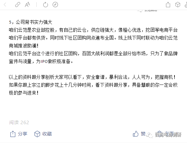 关于云范商城的推广人员们所极力推崇的“拼团模式”,事实上,在该商城横空出世之前,就已有不少主打拼团概念的平台抛头露面,比如“太极古芳”,微商电商调研此前就曾在《社交电商炒得火热,太极商圈与万一乐购缘何成为不少人眼中的“香饽饽”?》中有所提及,至于同样以拼团为模式卖点的友盟云商、自称省国资委旗下的茶交所、唐古拉优选拼团、幸运拼Lucky拼团等等项目或平台,都已遭到不少反传自媒体的曝光,显然,在现阶段,拼团模式要想得到长期、稳定的发展,还有很长一段路要走。