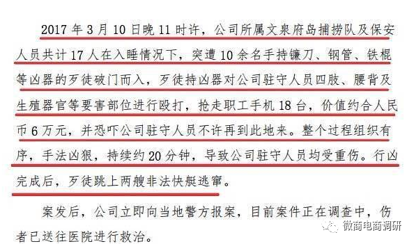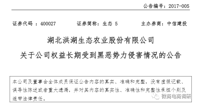 那么在2017年3月10日究竟发生了什么,据《湖北洪湖生态农业股份有限公司关于公司权益长期受到黑恶势力侵害情况的公告》显示,2017年3月10日晚11时许,公司所属文泉府岛捕捞队及保安人员共计17人在入睡情况下,突遭10余名手持镰刀、钢管、铁棍等凶器的歹徒破门而入,歹徒持凶器对公司驻守人员四肢、腰背及生殖器官等要害部位进行殴打,抢走职工手机18台,价值约合人民币6万元,并恐吓公司驻守人员不许再到此地来。整个过程组织有序,手法凶狠,持续约20分钟,导致公司驻守人员均受重伤。行凶完成后,歹徒跳上两艘非法快艇逃窜。案发后,公司立即向当地警方报案,目前案件正在调查中,伤者已送往医院进行救治。“3.10打砸抢”事件性质之恶劣程度前所未有,不仅严重侵害了公司的合法权益,并且对公司员工的基本人身安全造成重大伤害,同时还波及公司管理团队及全体员工,导致人心浮动,捕捞工作完全停止,正常的生产经营工作也陷入全面停滞。