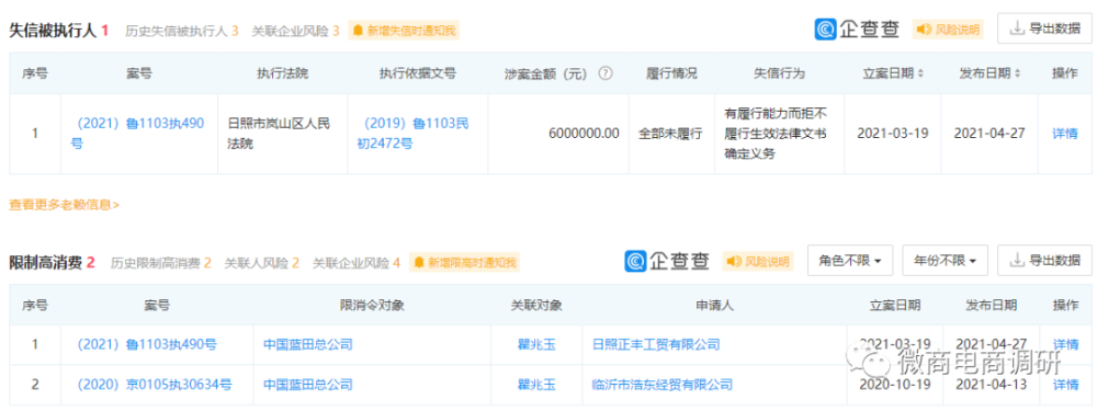 现如今,不光是瞿兆玉本人已遭到了限制高消费,连中国蓝田总公司也已沦为失信被执行人。据企查查显示,该公司的自身风险信息多达304条,关联风险信息则累计到了785条。