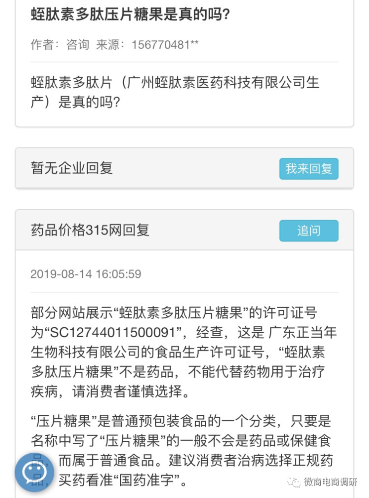 另外,我们也在药品价格315网上进行了咨询,对方表示:蛭肽素地龙蛋白多肽压片糖果不是药品,不能代替药物用于治疗疾病。同时,丽假乐也属于普通食品,没有任何功效,也没有价格管制,由销售商自主定价销售。压片糖果是普通预包装食品的一个分类,只要是名称中写了压片糖果的一般不会是药品或保健食品,而属于普通食品,建议消费者治病选择正规药品,买药看准“国药准字”。
