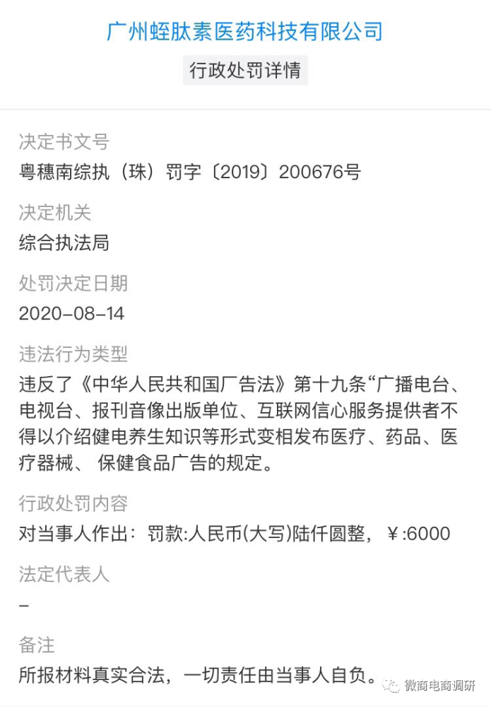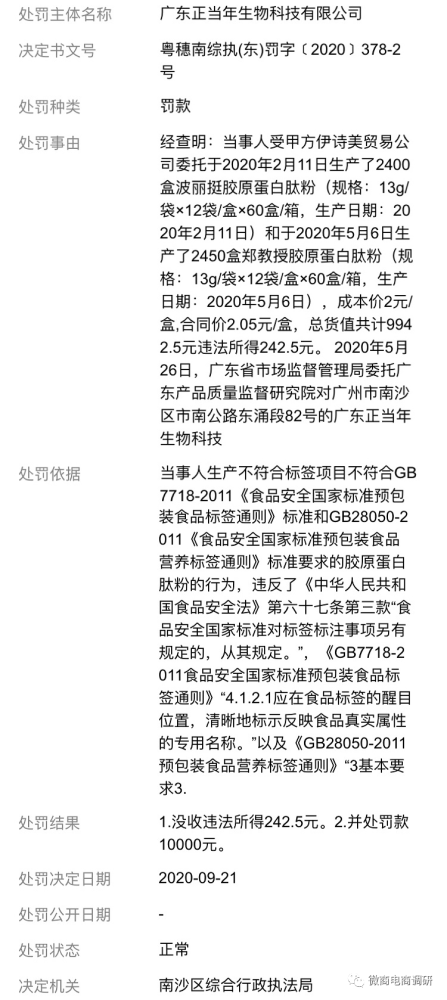 除此之外,作为上医本草的生产商,广东正当年生物科技有限公司也在2020年9月,因生产不符合标准要求的胶原蛋白肽粉的行为,最后没收违法所得242.5元并处罚款10000元。