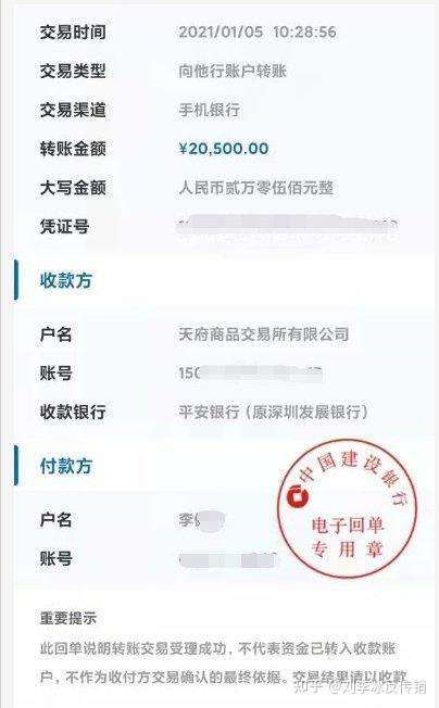 根据李先生提供的转账信息可看出,2021年1月5日上午10点到11点期间,李先生先后两次向户名为“天府商品交易所有限公司”分别转账20500元和19500元,共计4万元。还有一份时间为2020年12月29日17:09,李先生向账户名为“广东田苑科技有限公司”转账1000元的转账记录。