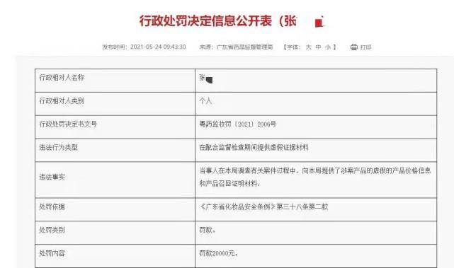 行政处罚决定书显示,在调查期间,张某某故意提供虚假产品销售价格及作假的产品召回文件证据给办案人员。依据《广东省药品监督管理局规范行政处罚自由裁量权适用规则》相关规定,张某某的违法行为符合从重处罚情形。同时,张某某的相关行为违反了《广东省化妆品安全条例》相关规定,结合上述自由裁量情况,广东省药监局决定对张某某从重处罚20000元。