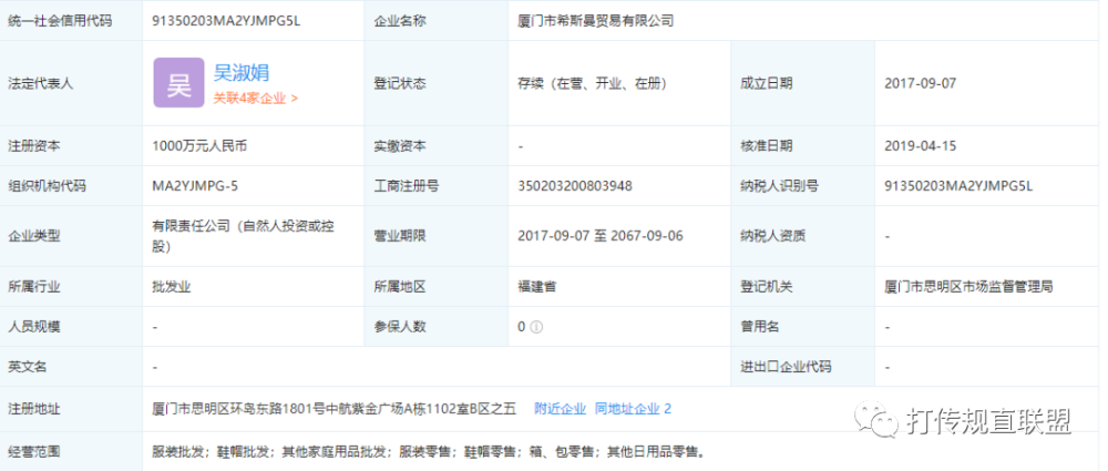 企查查信息显示,厦门希斯曼于2020年1月9日被厦门市思明区市场监督管理局列入经营异常名录,也就是说,目前希斯曼微商依托于上文提及的上海两家公司。