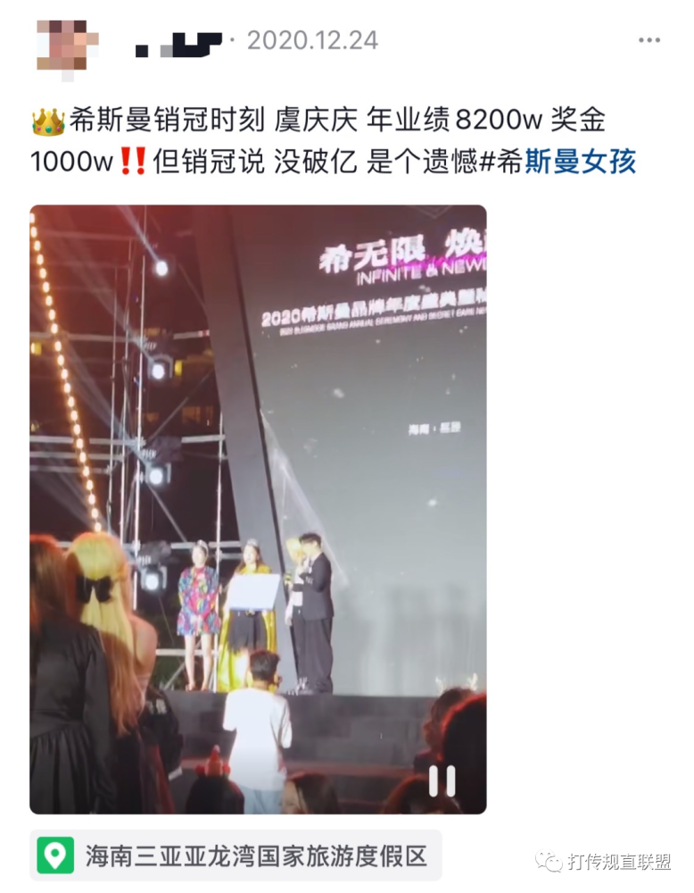 美商社在社交平台上观察到,去年年底,有代理分享了希斯曼销冠时刻,当时,虞庆庆所在的U.one团队以8200万年业绩收获销售冠军,并得到1000万奖金。
