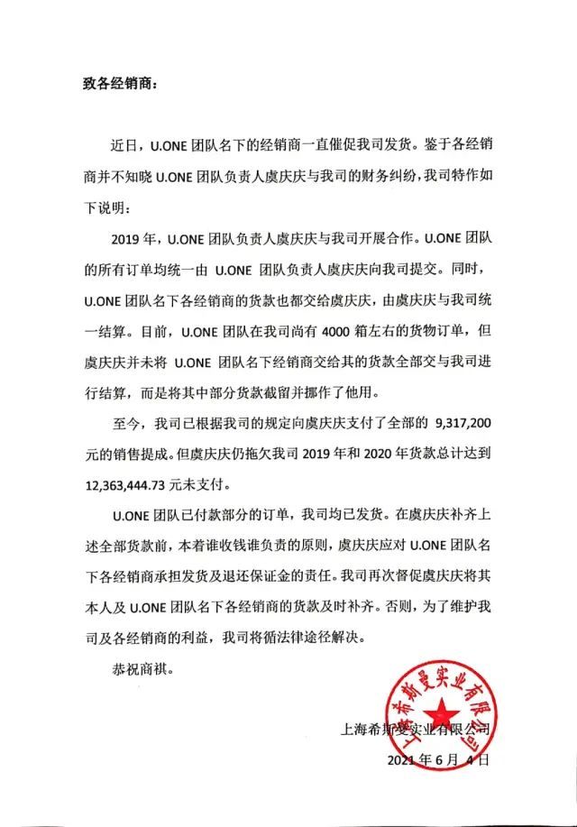 6月4日,伴随近半年多不发货,代理抱怨声四起,处在舆论漩涡中的希斯曼品牌方在其微信公众号发布《就公司对近日事件U.one团队发货未能及时做出说明》文章,对该事件进行了解释。